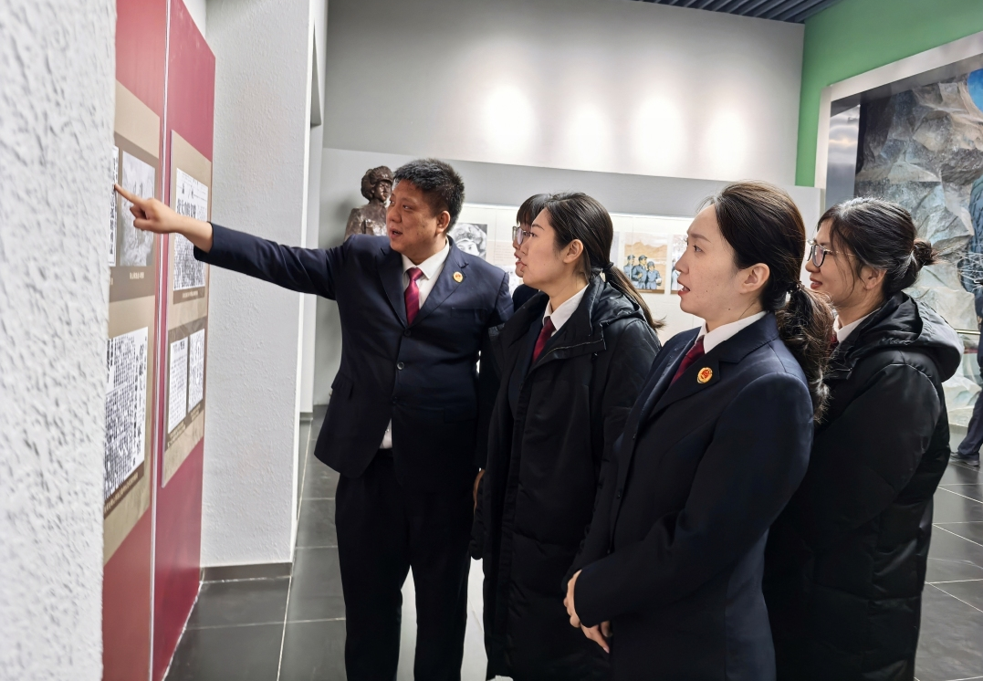 庄严肃穆的烈士纪念馆内,干警们整齐列队,跟随讲解员依次参观了“建立新中国浴血奋战”“艰苦创业建设新鞍山”“锐意进取全面振兴鞍山”“谱写中国式现代化鞍山篇章”四大主题展厅。一幅幅泛黄的照片、一件件斑驳的文物,配合声光电交织的沉浸式场景,革命年代的烽火岁月跃然眼前,生动再现了先烈们为民族独立、人民解放抛头颅洒热血的壮烈历程。干警们驻足凝视、认真聆听,时而低声交流感悟,时而用手机记录震撼瞬间,展馆内涌动着崇敬与追思之情。