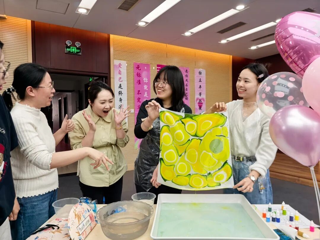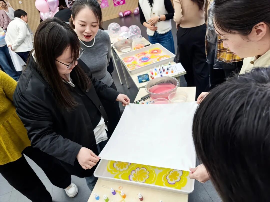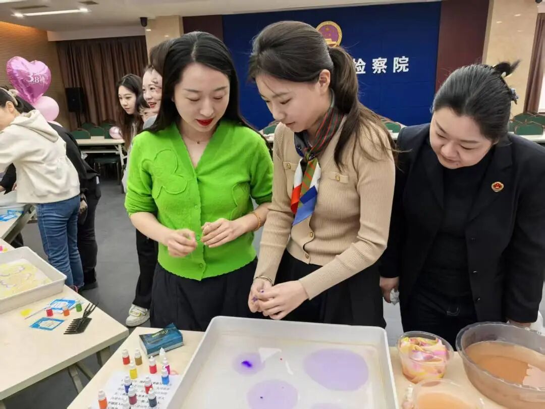 活动当日,铁东检察院六楼会议室一改往日的庄严肃穆,化作一方流动的艺术天地。调色盘中,靛蓝、嫣红、鹅黄次第晕染;水拓盆内,画针轻挑,涟漪微漾。女干警们凝神屏息,或轻点颜料成星,或勾勒水波成纹,丝巾覆水一瞬,斑斓画卷跃然其上。有人以“正义天平”为灵感,蓝白交织象征法治清明;有人将“检徽红”融入纹样,赤色流淌如初心炽热;更有人以抽象笔触捕捉春意,似柳枝拂水,若繁花映空。活动现场欢声笑语,工作压力随水波消散,创意与温情交织,数十幅作品悬挂展厅,宛若春日里绽放的“法治之花”。